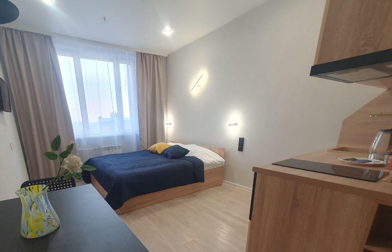 - Мебель: Угловая кухня, просторные шкафы для одежды (под потолок), двуспальная кровать, стол, стулья.